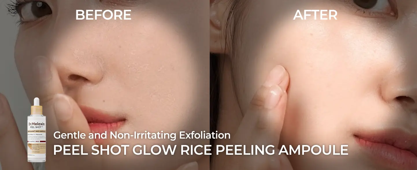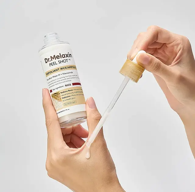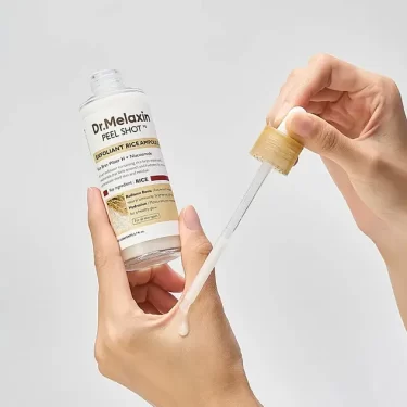 Dr.Melaxin – Peel Shot Exfoliating White Rice Ampoule – відлущуюча ампула з екстрактом рису. Її формула містить зволожувальні та освітлювальні екстракт рису та воду з рисових висівок, які в поєднанні з ніацинамідом надають шкірі сяйво та потужний антиоксидантний ефект. М’яке відлущування відмерлих клітин і розгладження шкіри забезпечують кислоти PHA (глюконолактон) і BHA (саліцилова кислота). На додаток, гіалуронова кислота та її похідні зволожують та ще більше розгладжують шкіру після застосування ампули, візуально звужуючи розширені пори.